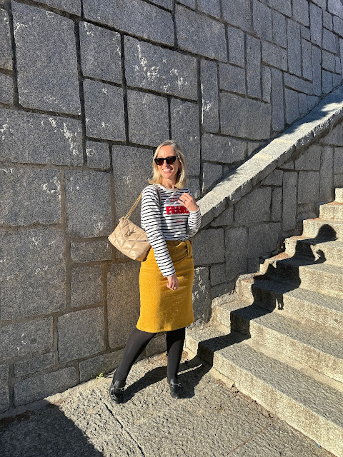 Cuando vi la falda sabía que llevaba mi nombre y, aunque me pareció complicada de combinar, le vi muchísimas oportunidades. La compré a principios de febrero, me la he puesto varias veces y todas ellas combinada de maneras distintas aunque nunca había tenido oportunidad de fotografiarla pero creo que este es mi outfit favorito por el contraste entre la falda dorada y brillante con una camiseta de rayas. Es arriesgado y precisamente por eso me gusta tanto. Y quise darle otra oportunidad a los mocasines negros antes de que vuelvan a una caja con la llegada definitiva de la primavera y porque me gusta continuar con el negro de las medias y no meter ninguna distorsión más en el look.